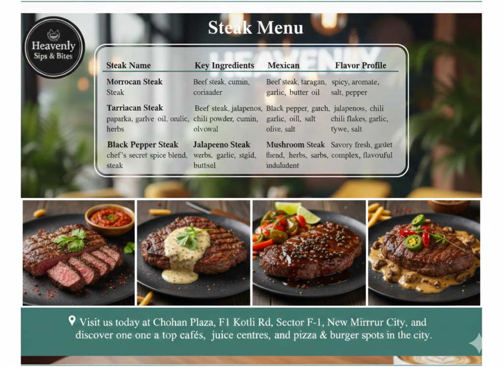 Are you a steak lover searching for the ultimate dining experience in Mirpur, Azad Kashmir? Many food enthusiasts struggle to find a place that serves high-quality, mouthwatering steaks paired with an inviting atmosphere.Heavenly Sips & Bites offers exactly that—a menu that satisfies every carnivore’s craving. From fiery Tarragon Steak to the luxurious Heavenly Special, each cut is designed to delight your taste buds.